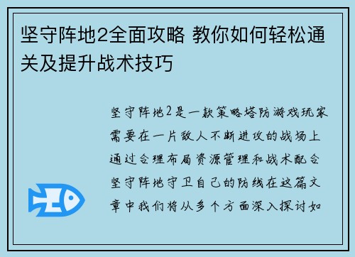 通过本文的介绍,我们详细探讨了《坚守阵地2》中的四大核心策略:理解游戏基本机制与塔防布局、资源管理与策略应用、提升敌人应对能力以及战术配合与团队协作。每个方面的精细操作都能够为玩家带来不同的游戏体验,帮助玩家在面对敌人的进攻时从容应对,轻松通关。