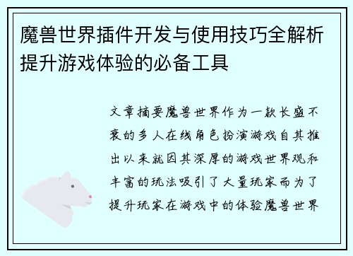 《魔兽世界》作为一款长盛不衰的多人在线角色扮演游戏,自其推出以来就因其深厚的游戏世界观和丰富的玩法吸引了大量玩家。而为了提升玩家在游戏中的体验,魔兽世界插件开发与使用技巧成为了许多玩家的重要工具。插件不仅能帮助玩家更好地管理任务、界面、战斗、资源等各个方面,还能根据个人需求进行优化,极大地提升游戏的流畅性和操作效率。本文将从插件开发技巧、使用技巧、常见插件类型以及如何根据需求选择插件四个方面,详细解析魔兽世界插件的应用及其对游戏体验的影响,帮助玩家全面了解如何使用插件来提升自己的游戏体验。
