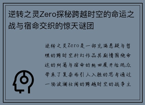 《逆转之灵Zero》是一部充满悬疑与哲理的跨时空科幻作品,其剧情围绕命运的纠葛与宿命的轮回展开,给观众带来了复杂而引人入胜的思考。通过一场波澜壮阔的跨越时空的战争,主角们不仅面临着外部世界的冲突与变化,更要直面内心深处的宿命与选择的挑战。故事中的时间线交织,人物的命运错综复杂,每个决定都可能导致无法预知的后果。本文将深入探讨《逆转之灵Zero》所构建的命运与宿命的主题,具体从四个方面展开:第一,逆转之灵Zero的故事背景和设定;第二,命运与宿命的哲学探讨;第三,跨越时空的命运之战;第四,宿命交织中的惊天谜团。通过这些角度,我们可以更好地理解这部作品如何呈现一个充满张力与哲理的世界。