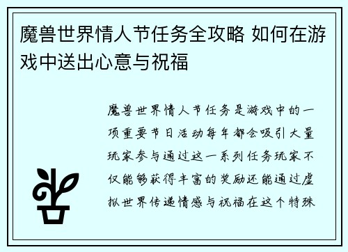 《魔兽世界》情人节任务是游戏中的一项重要节日活动,每年都会吸引大量玩家参与。通过这一系列任务,玩家不仅能够获得丰富的奖励,还能通过虚拟世界传递情感与祝福。在这个特殊的节日里,玩家们通过一系列互动,表达心意、传递祝福,与游戏中的朋友们共同庆祝这一浪漫的时刻。本文将详细介绍《魔兽世界》情人节任务的攻略,包括任务的主要内容、参与方式、奖励及心意传递的方式。无论你是新手还是老玩家,都可以通过这篇文章了解如何在魔兽世界中完成情人节任务,送出心意与祝福。