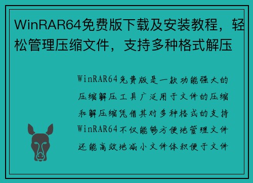 WinRAR64免费版是一款功能强大的压缩解压工具,广泛用于文件的压缩和解压缩。凭借其对多种格式的支持,WinRAR64不仅能够方便地管理文件,还能高效地减小文件体积,便于文件传输和存储。在这篇文章中,我们将详细介绍WinRAR64免费版的下载及安装教程,并重点讲解其如何轻松管理压缩文件,支持多种格式解压缩功能。文章将从四个方面进行阐述:WinRAR64免费版的下载安装、软件界面的功能介绍、常见压缩格式的支持情况,以及如何使用WinRAR64进行文件管理。通过本文的学习,您将能够全面掌握WinRAR64的使用技巧,提升日常文件处理效率。