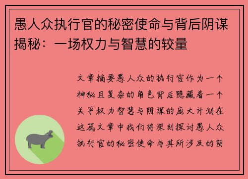 文章摘要:愚人众的执行官作为一个神秘且复杂的角色,背后隐藏着一个关乎权力、智慧与阴谋的庞大计划。在这篇文章中,我们将深刻探讨愚人众执行官的秘密使命与其所涉及的阴谋,分析这场权力与智慧的较量。文章从四个方面展开,首先揭示愚人众执行官的角色定位和其与其它势力的复杂关系;其次分析其秘密使命的目标与执行策略;接着深入探讨背后隐藏的政治阴谋及其对整个世界的潜在影响;最后,文章总结这场智力和权力较量的深远意义,提出愚人众执行官在其中扮演的关键角色。通过细致的分析,我们将一窥这场复杂博弈的真相。